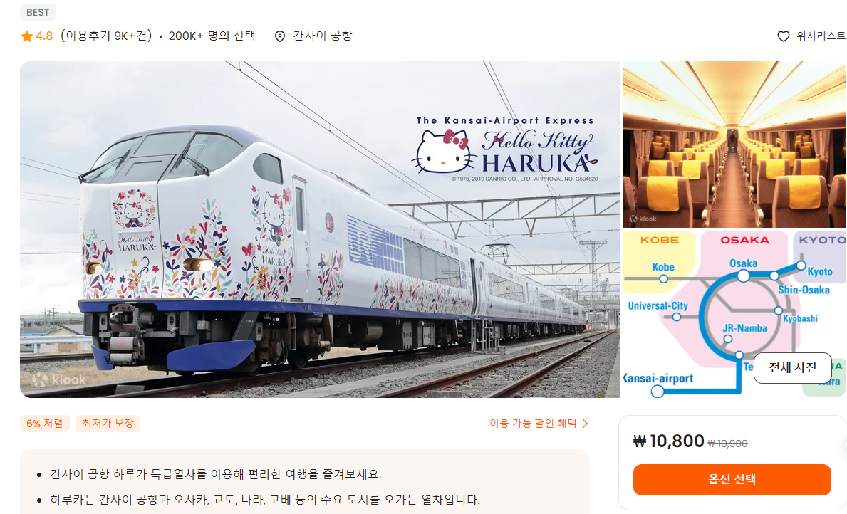 그 이유는 하루카로 이동시 소요시간이 1시간 20분 밖에 안 걸리고 요금이 편도 기준 3만 원으로 비싸지만 국내에서 구입을 하면 1만 7천 원대에 아주 저렴하게 구입할 수 있습니다.