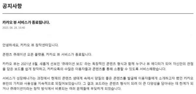 카카오뷰 창작센터는 '큐레이션 보드' 기능을 통해 개인이 뷰 편집자 역할을 맡을 수 있게 된 서비스 종료를 8월 29일 공식적으로 발표했다.